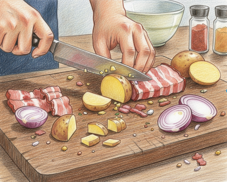 じゃがいもは皮をむいて一口大の乱切りにし、玉ねぎは1cm幅に切ります。ベーコンは食べやすい1cm幅に切りましょう。