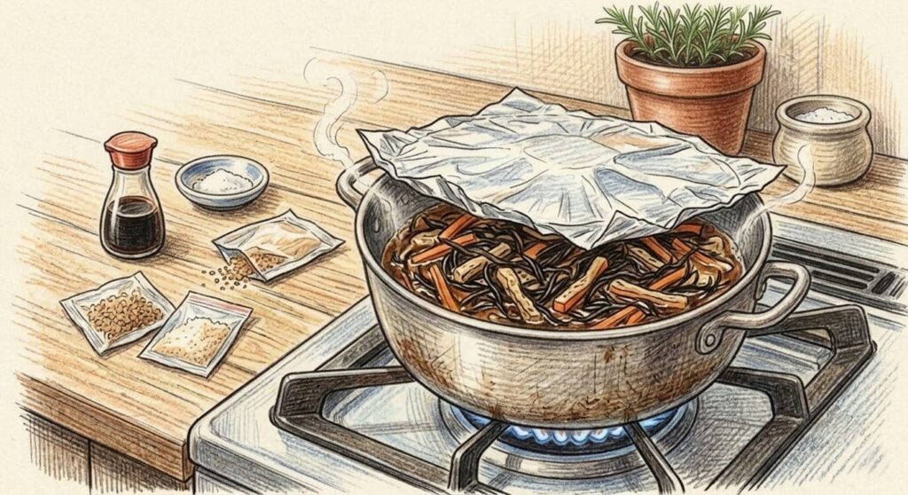 水、砂糖、醤油、みりん、酒、顆粒和風だし、味の素を加えます。煮立ったら弱火にし、アルミホイルなどで落とし蓋をして10分ほど煮込みます。