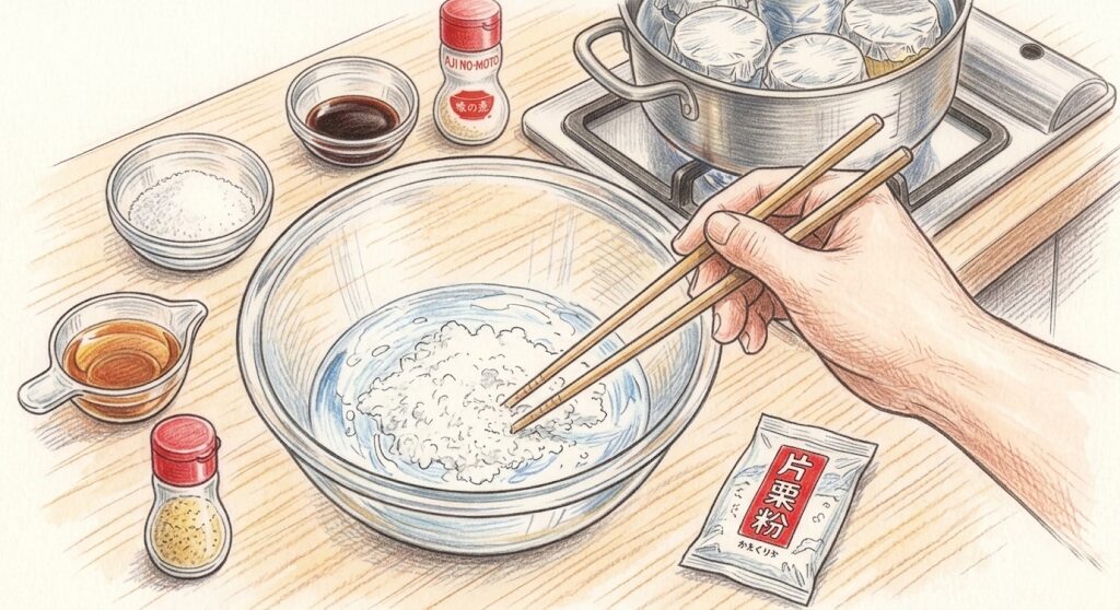 まずはボウルに水50mlと片栗粉小さじ1を入れてよく溶かします。そこに砂糖大さじ1と和風だし小さじ1、醤油小さじ1/2、うま味調味料3振りを加え、片栗粉の粉っぽさがなくなるまでしっかり混ぜてください。
