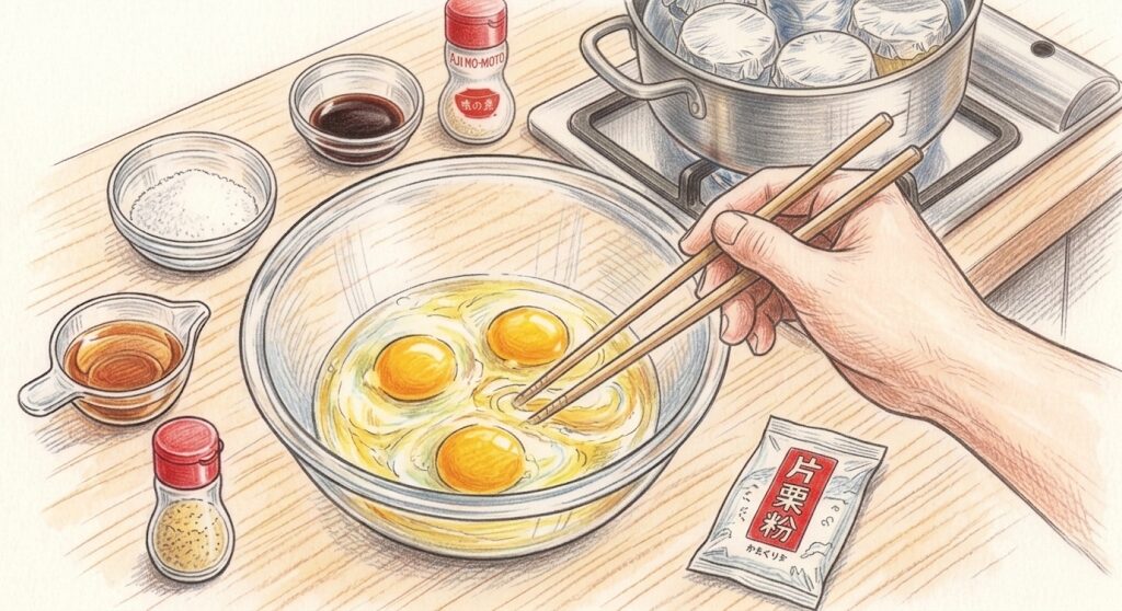 - うま味調味料: 3振り (味の素などが卵のコクを引き立てる隠し味です)