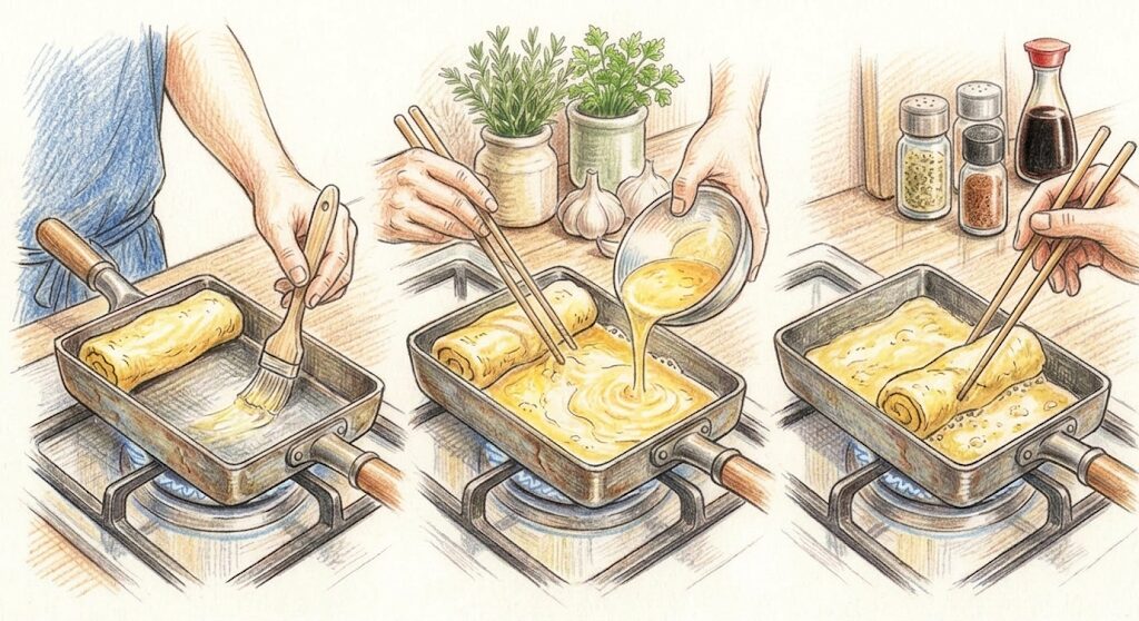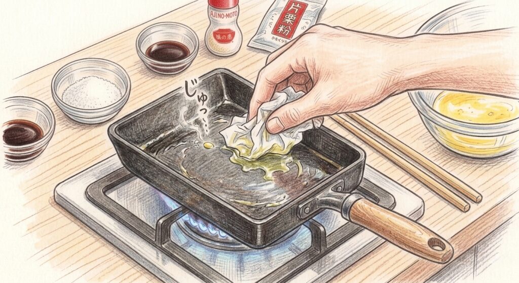 卵焼き器を弱めの中火で温めます。キッチンペーパーにサラダ油をたっぷり含ませて、フライパンの底と側面全体によくなじませてください。箸先につけた卵液を少し落として、ジュッと音がしたら焼き始める合図です。