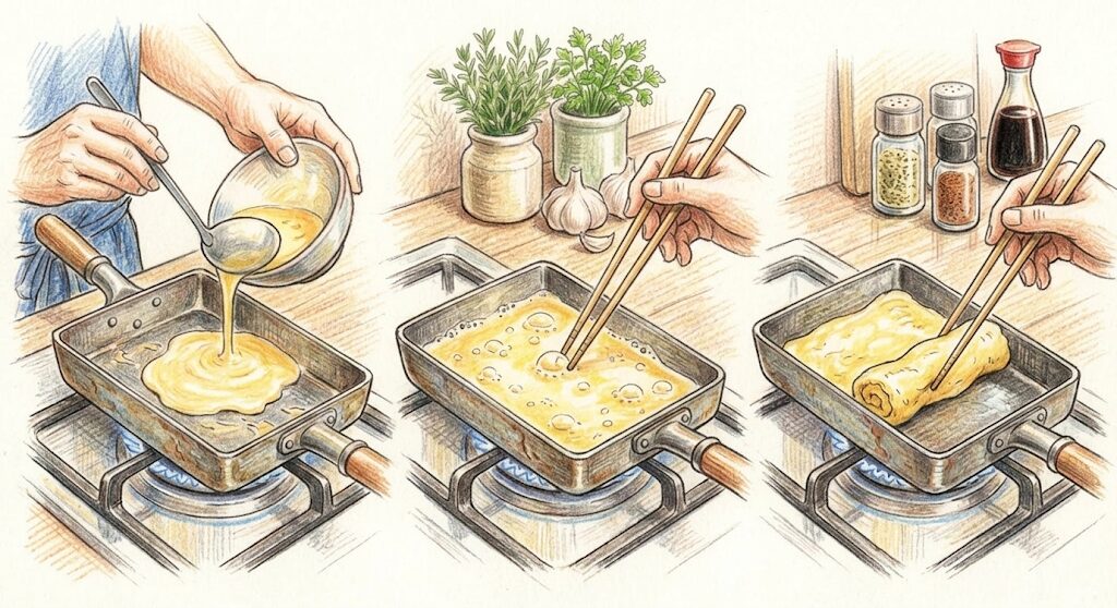 卵液はお玉などで3回から4回に分けて入れます。まずは1回分を流し入れて全体に広げてください。プクプクと気泡ができたら箸でつぶし、表面が半熟になったら奥から手前にパタパタと巻きます。この段階では形が少し崩れても気にしなくて大丈夫ですよ。