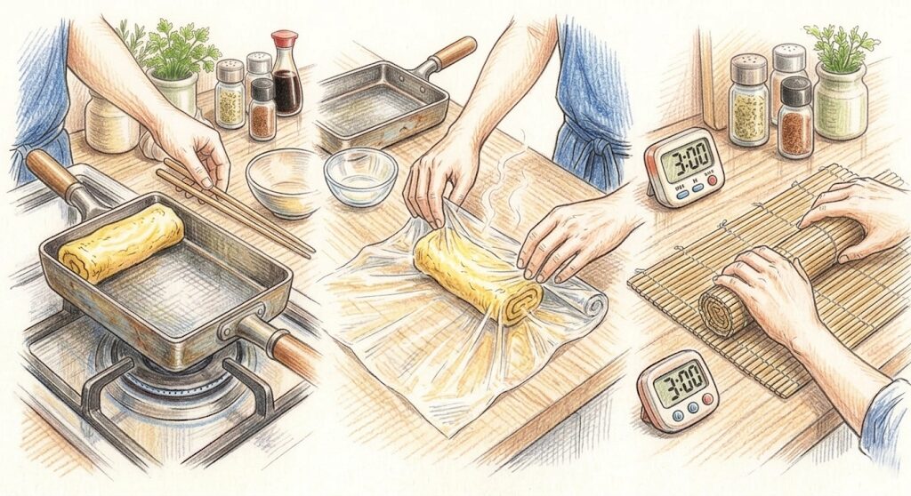 残りの卵液も同じように焼いて巻き終えたら火を止めます。温かいうちにラップや巻きすで包んで3分ほど置いておきましょう。余熱で中までじっくり火が通り、形がきれいに整います。
